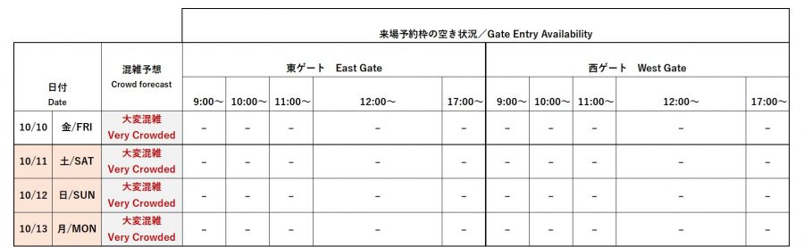 On-site (same-day) tickets allowing entry from 12:00 (“Weekday Tickets”, “Special Tickets”) will be exchanged starting at 11:00, and tickets allowing entry from 16:00 (“Night Tickets”) will be exchanged at ticket counters near the East gate starting at 11:00 on October 10.
