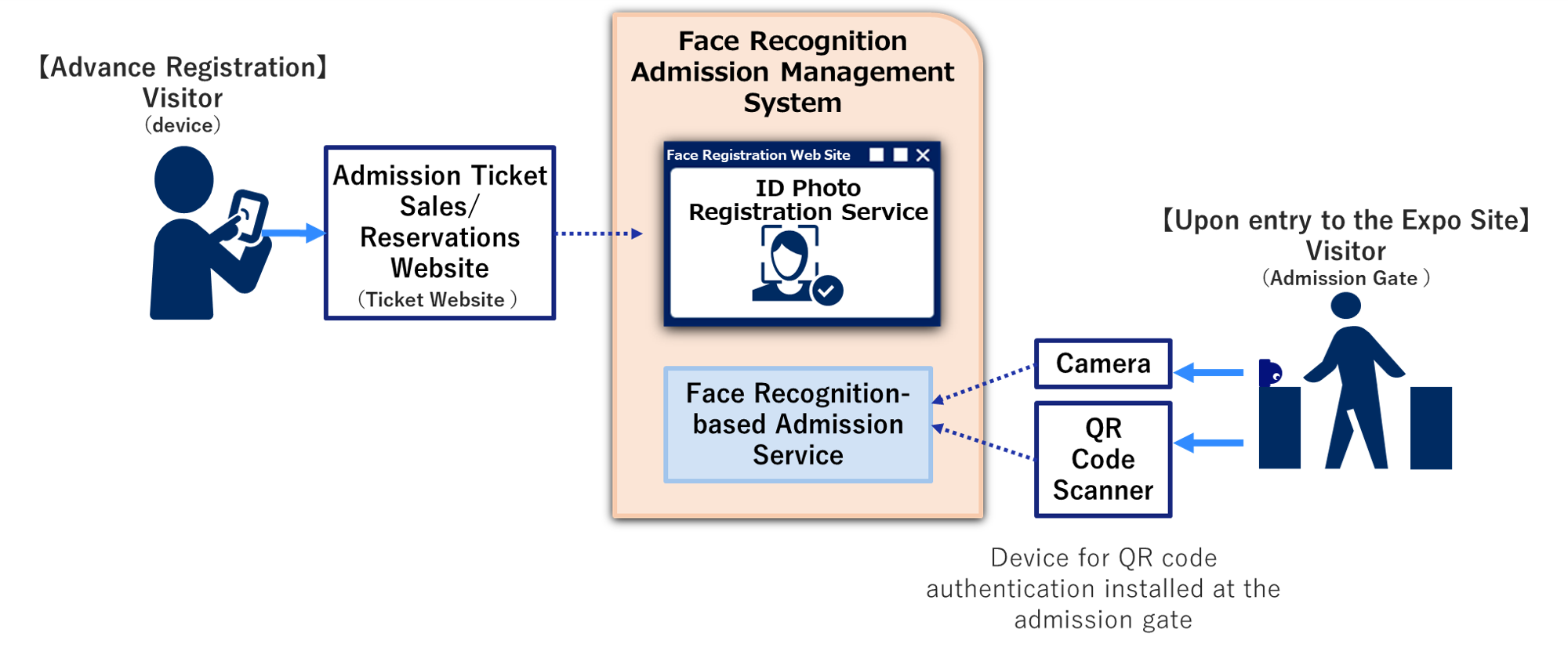 When a person with a valid pass enters 51 admission gates of the entrances to the Expo site, they hold up the QR code on the ticket over the gate and undergo face recognition using a camera installed at the gate for identification. This will also prevent identity fraud by lending and borrowing tickets.