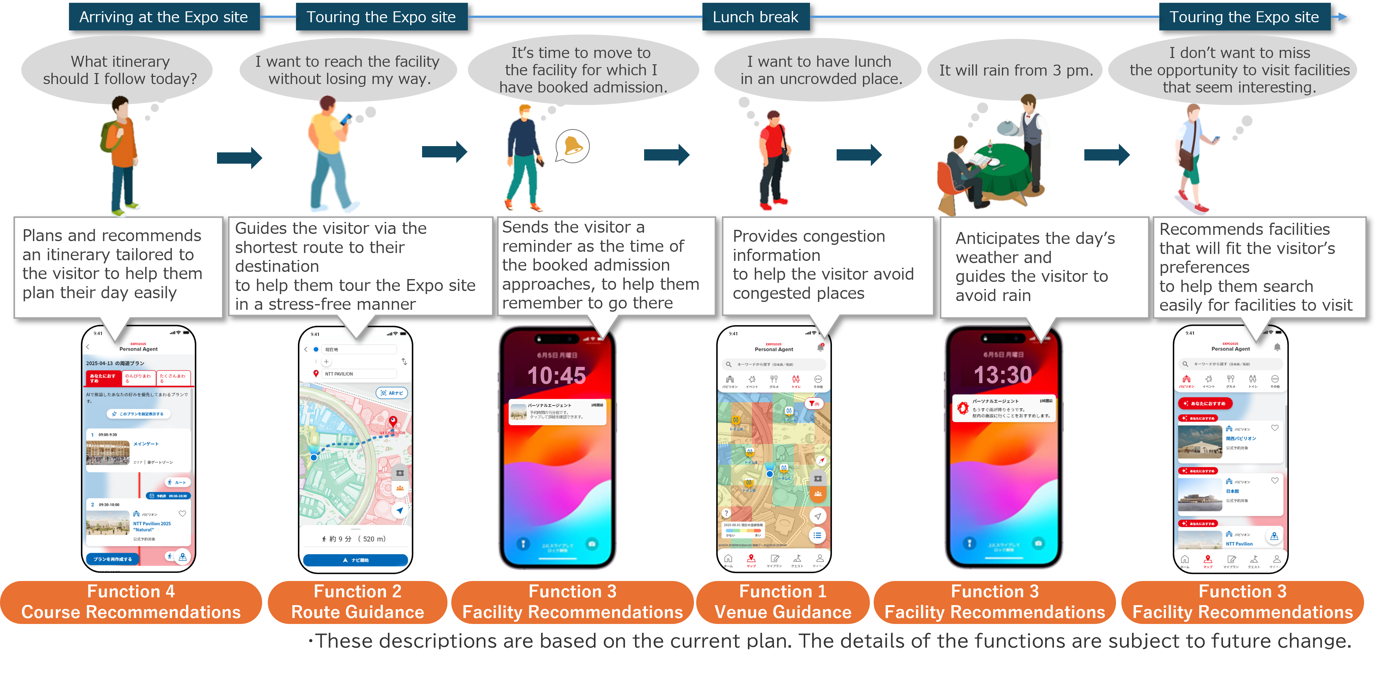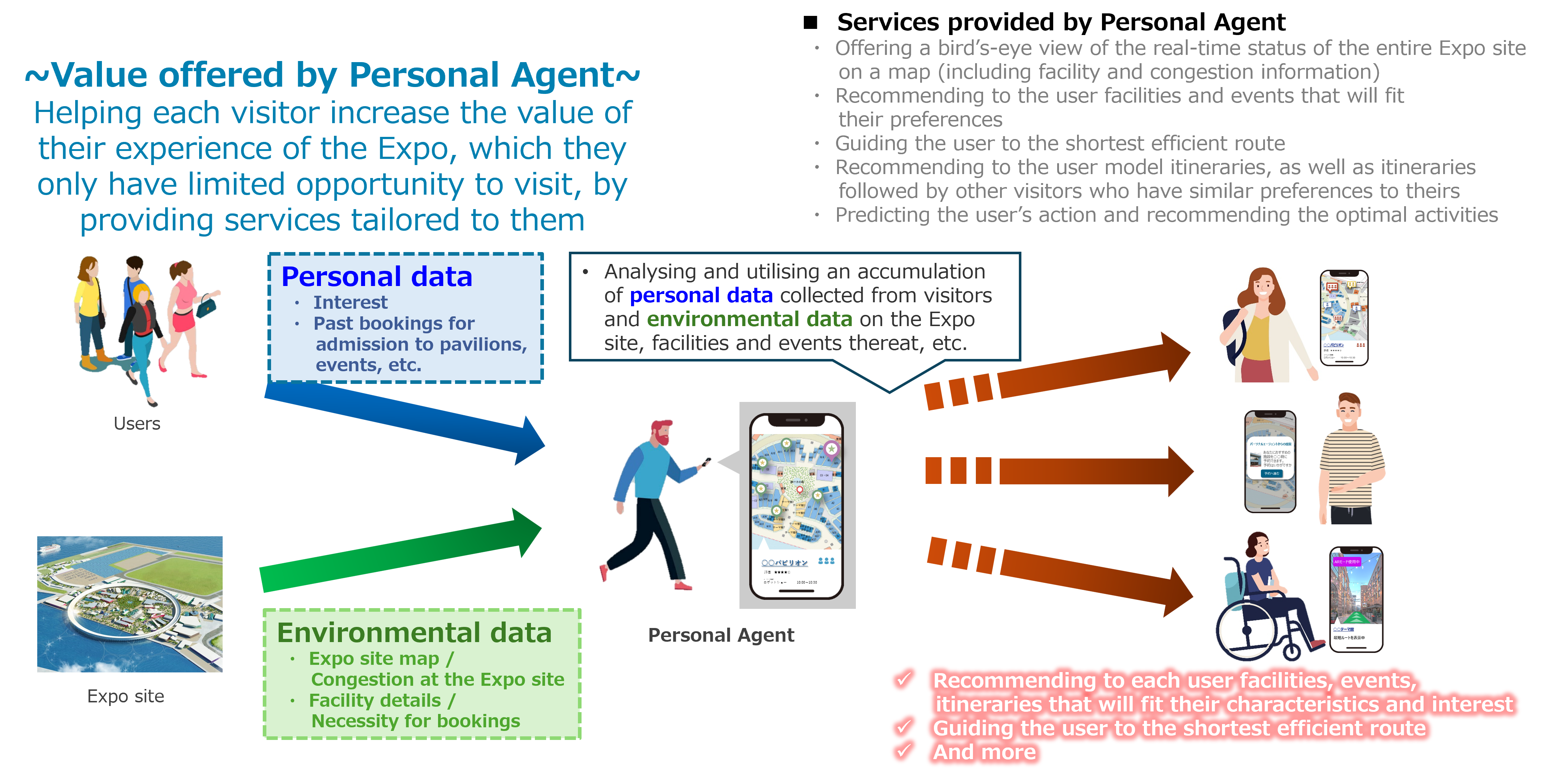 The EXPO2025 Personal Agent uses AI-assisted analysis of a wide range of data to recommend to each user a model itinerary for the day and activities they can engage in until the time of their booked admission to the next pavilion. It also provides information on the Expo site, including facilities and the status of congestion, and guides the user via the correct route to their destination so that they can get there without losing their way. Offering not only maps but also AR-based guidance, the Personal Agent allows the user to intuitively know which direction they should go, even if they are not very good at understanding maps. Moreover, it also collects ideas for a future society from visitors and uses AI to integrate them into collective wisdom in the form of artworks and abstracts, thereby helping share the ideas of 8.0 billion people on the globe.