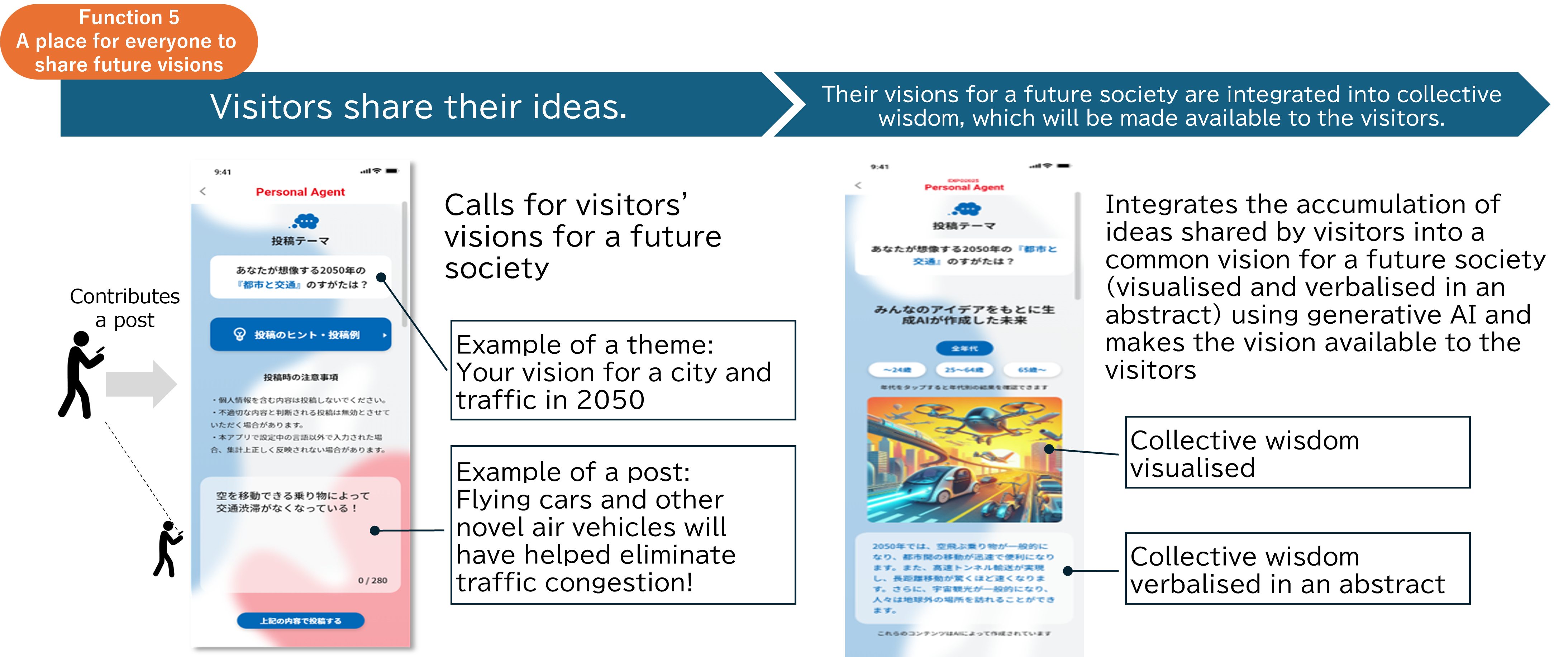 | [Function 5: A place for everyone to share their future visions] | The Personal Agent app will call for visitors to share their visions for a future society, which will be verbalised and visualised as collective wisdom and be made available to visitors. The content created through the participation of visitors as contributors will allow them to become aware that they are taking part in the creation of a common vision for a future society. |