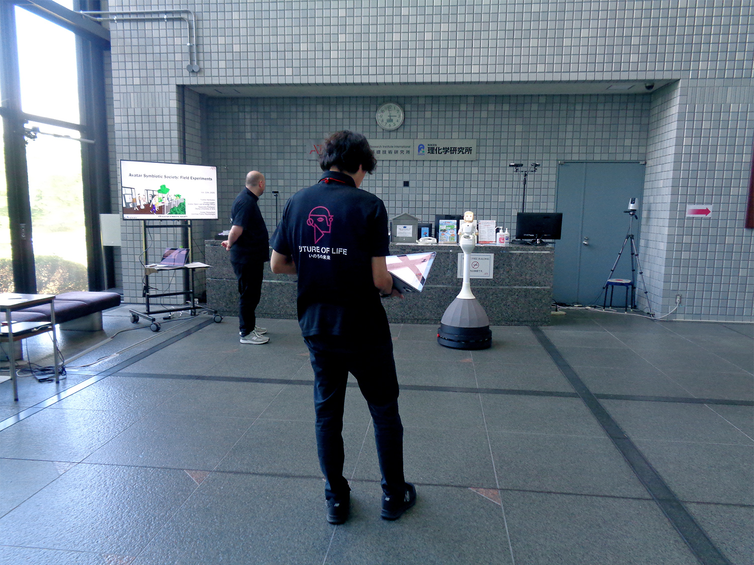 At ATR, Nishimura and Hitzmann are participating in the research and development project for “The Realization of an Avatar-Symbiotic Society where Everyone Can Perform Active Roles without Constraint” (Avatar-Symbiotic Society Project), where ISHIGURO Hiroshi serves as project manager. This is a project under Goal 1 “Realization of a society in which human beings can be free from limitations of body, brain, space, and time by 2050” of the Moonshot Research and Development Program (Moonshot), a national initiative being undertaken by Japan Science and Technology Agency (JST). The project is developing cybernetic avatars (CAs) to realize an avatar-symbiotic society. CAs are robot or computer graphics (CG) avatars that people can remotely control as their own avatars. The two researchers are carrying out research and development of mobile CAs capable of social activities such as security, tour guiding, and working as store clerks. Nishimura said that their involvement in the Future of Life signature pavilion was an extension of that work.