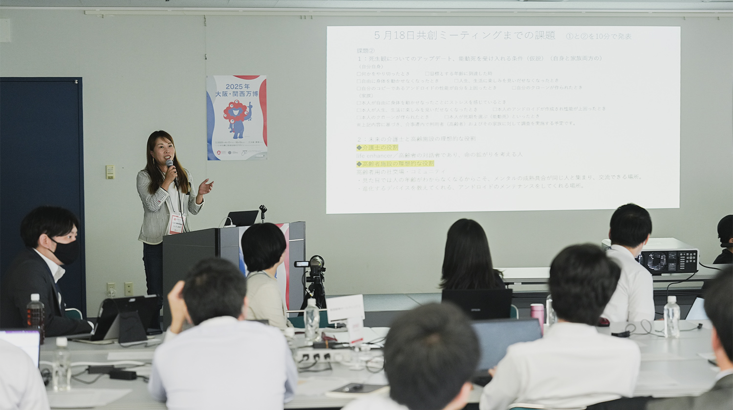 The Future of Life Co-creation Project 2025 launched in 2021 under the guidance of Producer ISHIGURO Hiroshi and seven participating companies (HASEKO Corporation, KOKUYO Co.,Ltd., SHIONOGI & Co., Ltd., Sysmex Corporation, Japan Federation of Kaigo Business Providers Consortium Expo 2025, DENSO CORPORATION, and Hankyu Hanshin Holdings, Inc.). The project looks at how society and life might be 50 years in the future (in 2075). Some of their ideas will be incorporated as future scenarios and technologies in the signature pavilion. The third All-Company Co-creation Meeting (referred to as “All-Company Co-creation MTG” below) featured an overall summary of the second term of the project, with each company presenting worldviews and scenario concepts.
