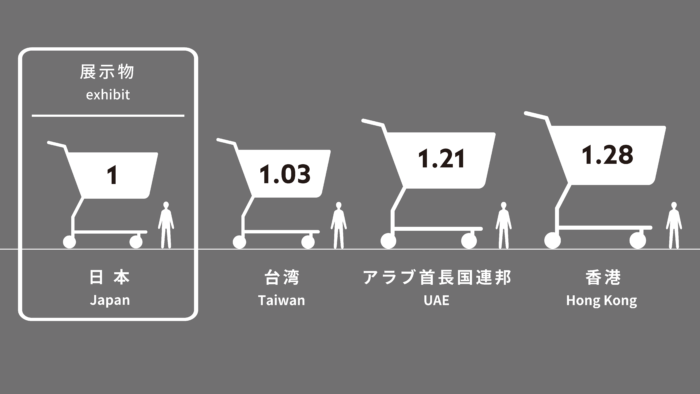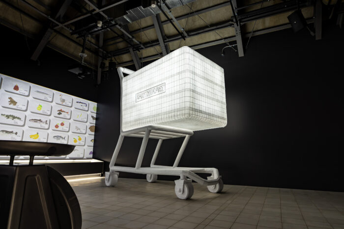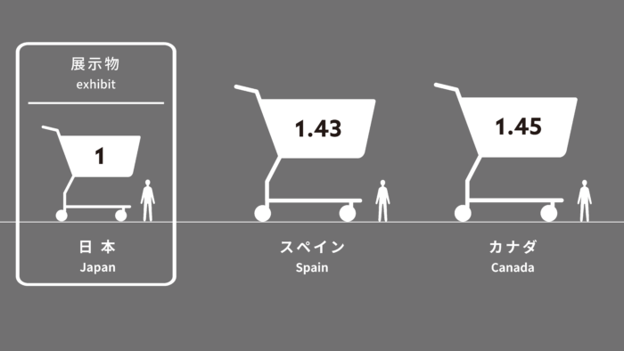 This huge shopping cart represents the volume of food Japanese people eat over the course of ten years. Based on the average annual food consumption of one Japanese person (approximately 618 kg), the total food volume is calculated by using the average weight density of the protein, carbohydrates, and so forth of each food item. The total volume is approximately 810 liters.