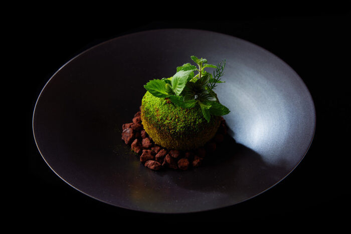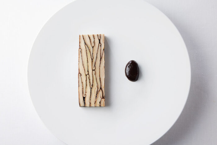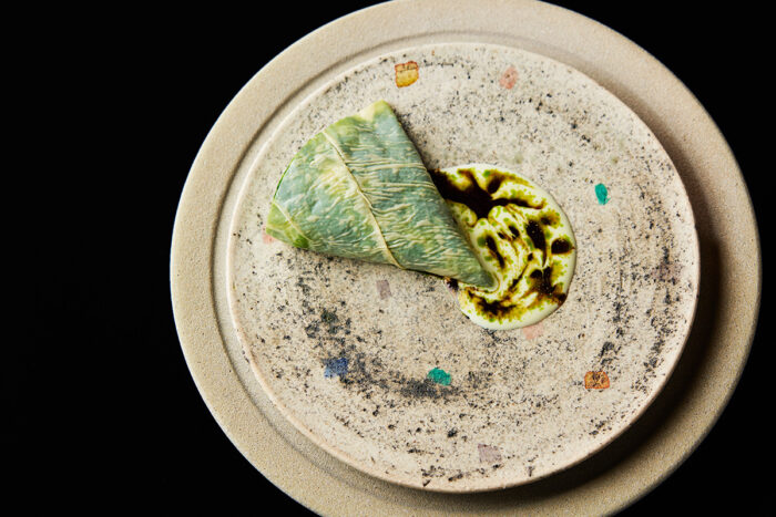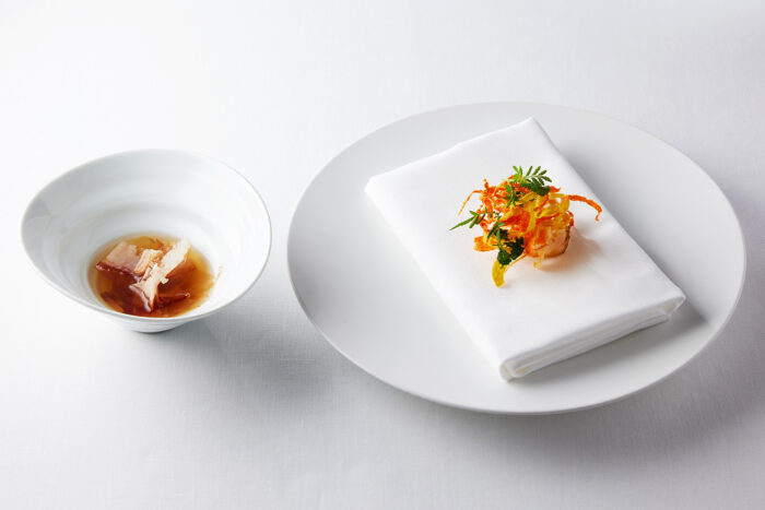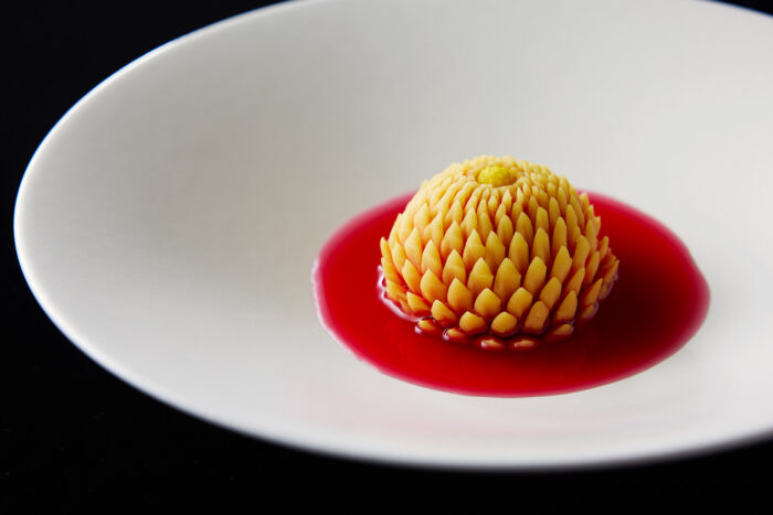 This delicate kingyoku jelly confection elicits a cool, refreshing sensation. As its sensual texture and lingering aroma envelop your senses, a noble fragrance reminiscent of ancient temples begins to emerge and awakens something clear and translucent within you. Crafted by Wataru Kanaya of Kyoto’s long-established confectioner Kanaya-Masahiro, this dessert captures the fruit and floral aroma of tachibana, Japan’s oldest citrus and now a near-threatened species. It is finished with a sauce made from the leaves and fruit of the tachibana tree.
