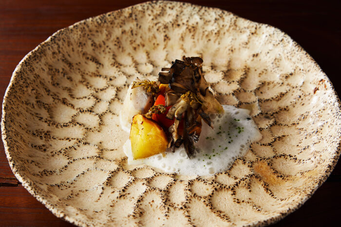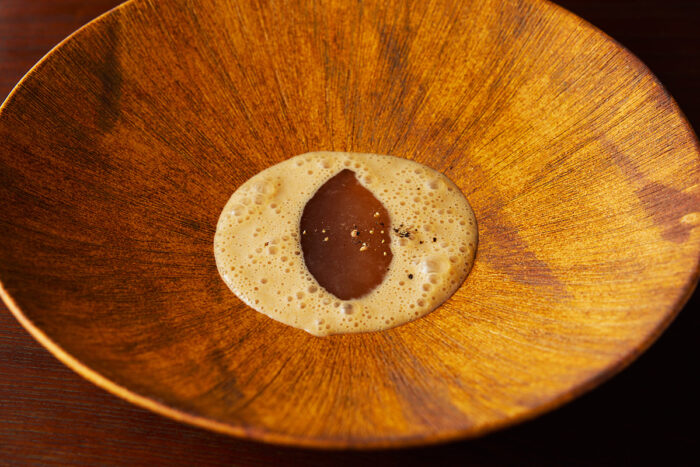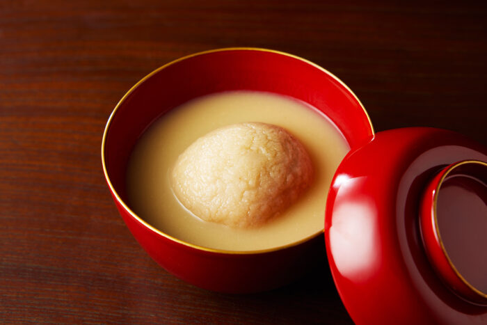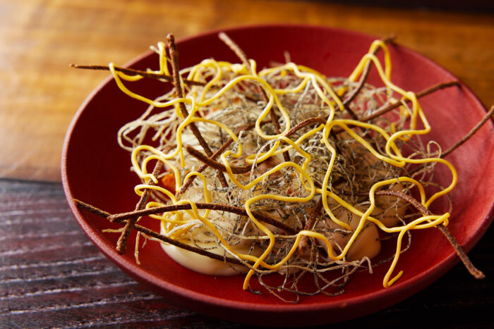 In Japan’s mountainous regions, there has long been a tradition of eating tochimochi (rice cakes made with Japanese horse chestnut seeds) during the New Year. Glutinous rice is pounded and mixed with chestnuts from the tochi tree—a process that requires immense effort since the nuts are poisonous and must be detoxified before they can be eaten. This dish has been reimagined with an eye toward preserving ozoni, a traditional New Year soup. It features mountain vegetables preserved in spring, wild chestnuts and mushrooms gathered in autumn, and a broth made from kuromoji and Japanese juniper. The result is a complex, sensual flavor. Said to have been a staple food in the Jomon period, it’s easy to imagine those ancient people savoring the same deep, evocative taste.
