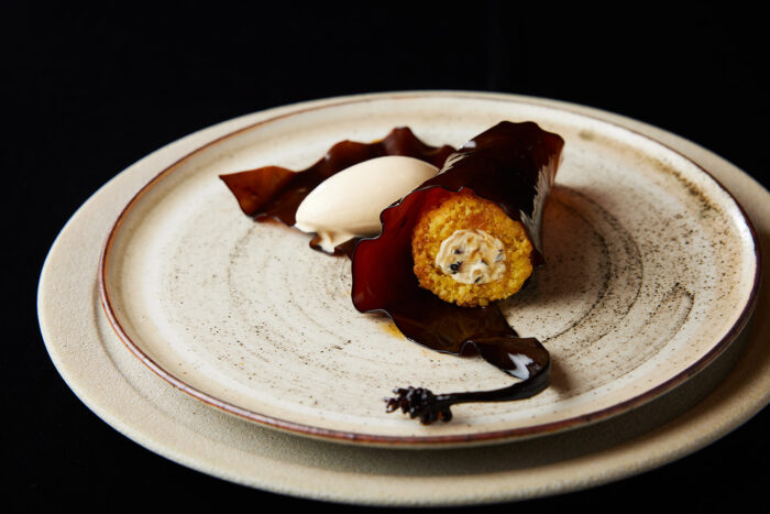 Young kombu preserved in black sugar syrup, roasted kombu ice cream and wild cherry sponge.