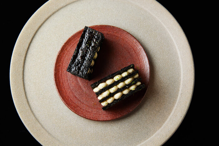 Mille feuille of caramelised amanori seaweed, fresh cacao curd and green bergamot.