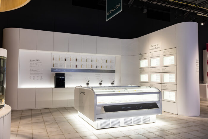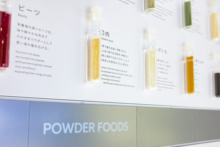 From vegetables, meat, fish, fruits, and seasonings to more underutilized resources and more, by freezing ingredients at −196°C and pulverizing them, they are transformed into powdered foods that can retain their flavor and nutritional value for decades. This “Evolving Frozen Food” exhibit features 24 varieties of powdered ingredients, ranging from familiar foods like carrots and chicken to more underutilized resources like loss flowers discarded during production, tree bark, and sea urchin shells—things not commonly considered food. By turning them into powders, even unconventional materials can unlock new culinary possibilities.