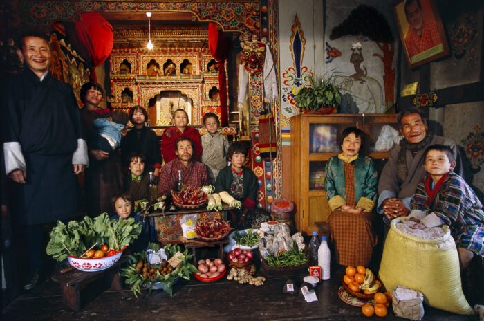 The 13 members of the Namgay family live in the remote hillside village of Shinka. Most of the homes in this village are three stories tall and made out of kneaded clay. The family uses a clay oven, which is placed directly on the clay floor, to cook home-grown red rice, grains, chilis, and other vegetables day after day. As Buddhists, they do not eat meat except during special periods such as Buddhist puja ceremonies. The average Bhutanese person consumes 3.3 kg of meat per year. They preserve meat and fish by letting them dry naturally. They get their protein from butter, whey, and cheese from the milk of domesticated cows. The village has no fast food restaurants.