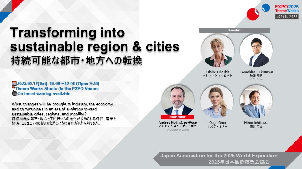 The programme, together with the General Sponsors, explores: 'What changes will be brought to industry, the economy, and communities in an era of evolution toward sustainable cities, regions, and mobility?'