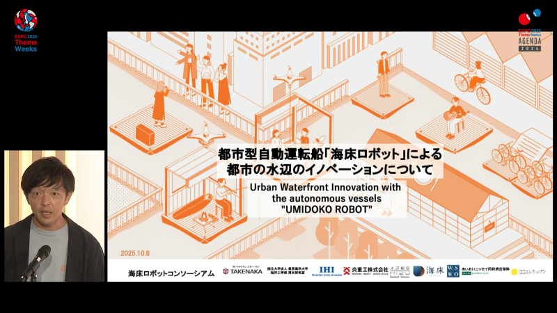 We have been developing the concept of Umidoko Robot, which is a robot creates a floor itself that moves around like a drone on the water automatically.We will discuss innovation of urban waterfront with those who are working on the development and implementation of an autonomous vessels, including Umidoko Robot, to solve common global issues facing urban waterfront, such as environment, energy, transportation, logistics, and disaster prevention.