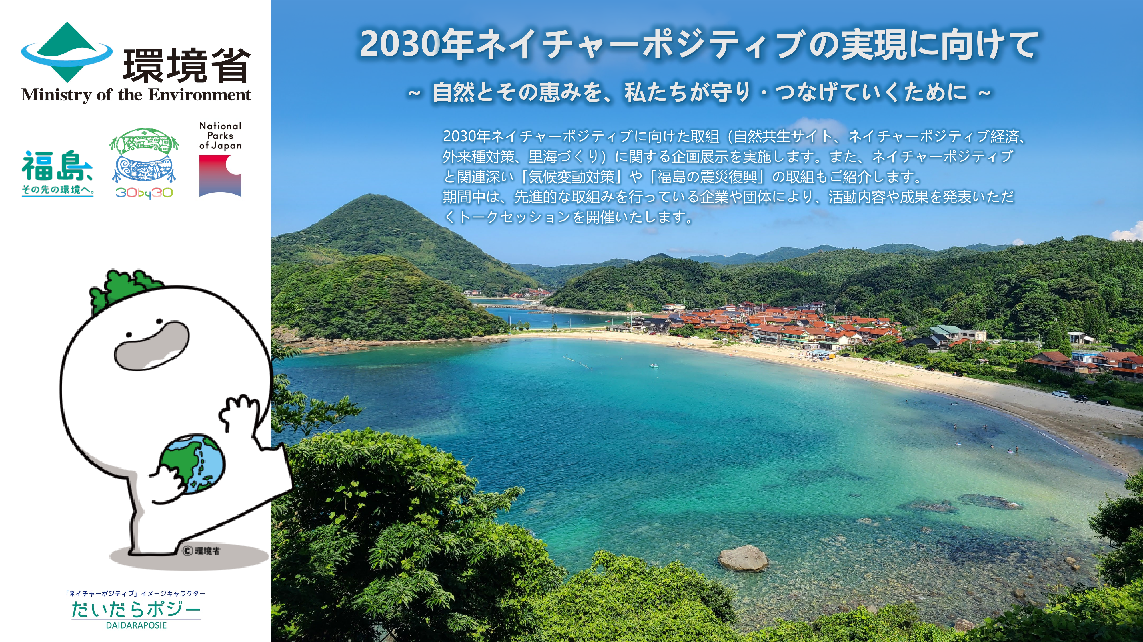 Special exhibition will be held on Japan's actions toward Nature-Positive by 2030, featuring examples such as Nationally Certified Sustainably Managed Natural Sites, Nature Positive Economy, measures against alien species, Satoumi creation, climate change measures, and reconstruction from the Great East Japan Earthquake in Fukushima.