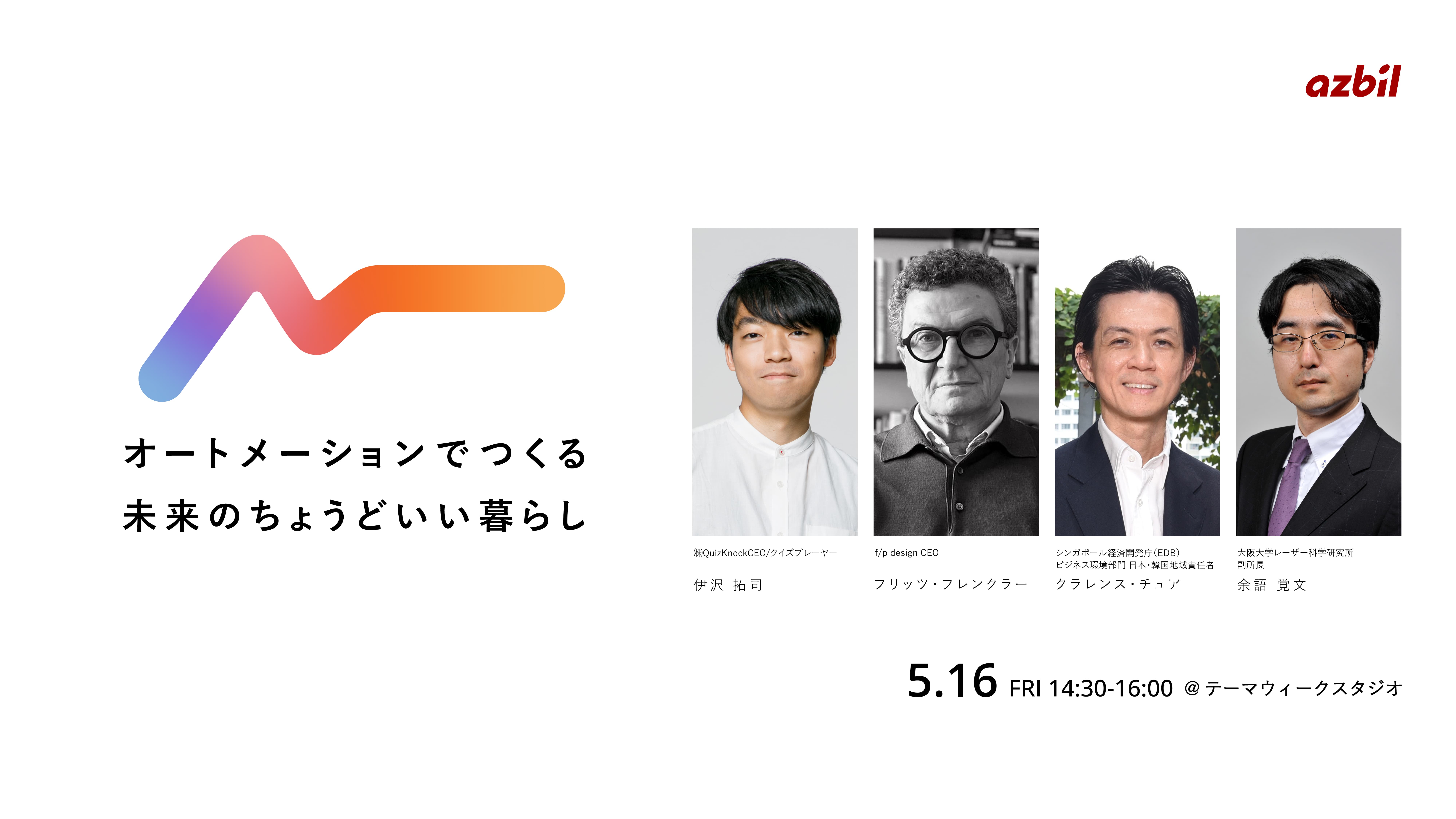 By 2050, we might see a world where human comfort and the Earth's environment are harmoniously balanced, in ways we can't even imagine today. Through Azbil's concept of "Human-Centered Automation," we will delve into themes such as smart cities, carbon neutrality, and rural urbanization to discuss the global future. Join us in envisioning the "well-balanced" or "chodo ii" lifestyle of future generations with our esteemed guests. We invite you to participate and help shape this vision!