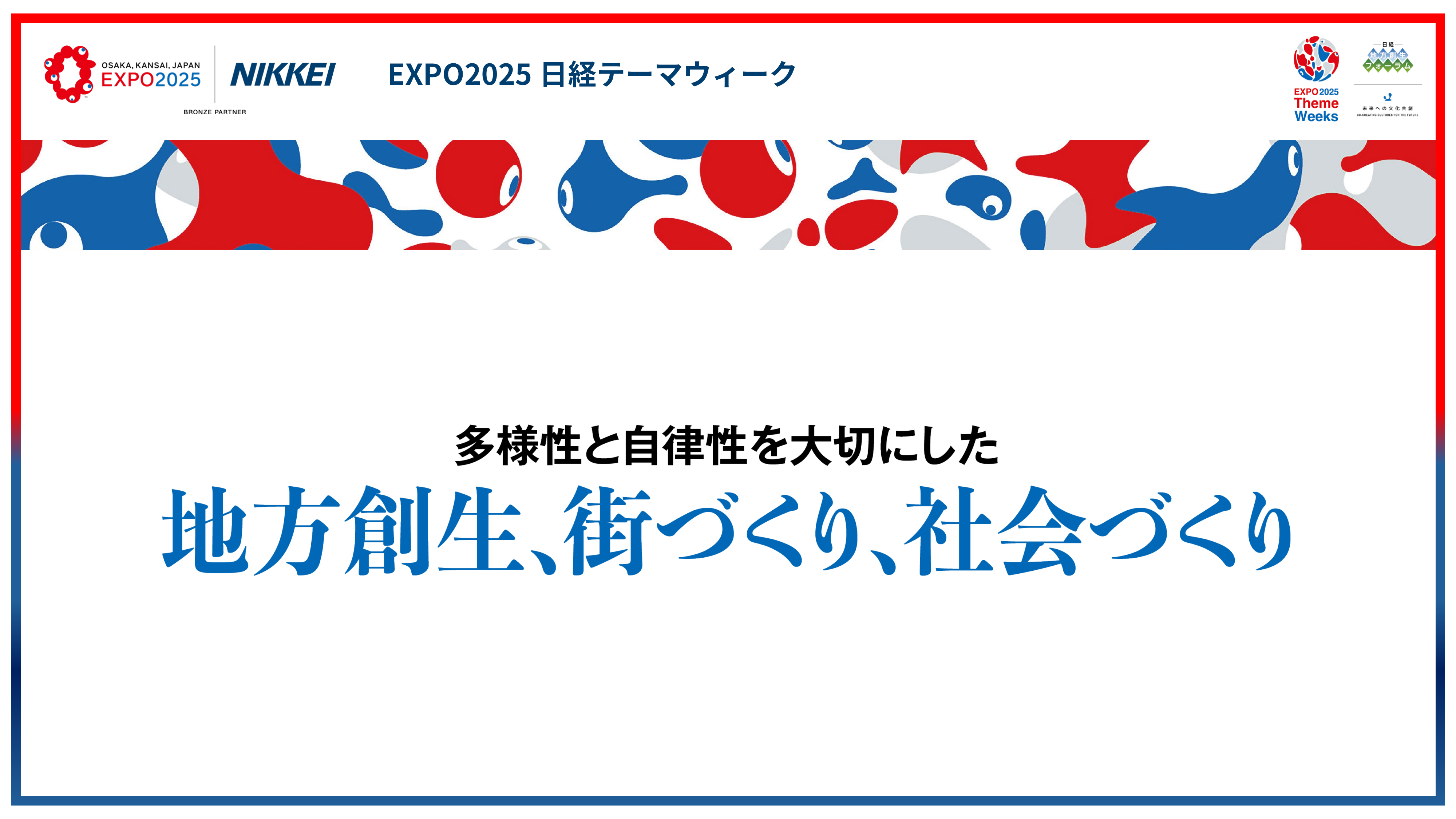 The Nikkei Regional Revitalization Forum is a project run by Nikkei Inc. that brings together leading companies and experts in the field of Regional Revitalization to learn and discuss together. This seminar, to be held at the site of the Expo 2025, will present current initiatives and discuss future prospects under the theme of “Cultural Co-Creation for the Future.