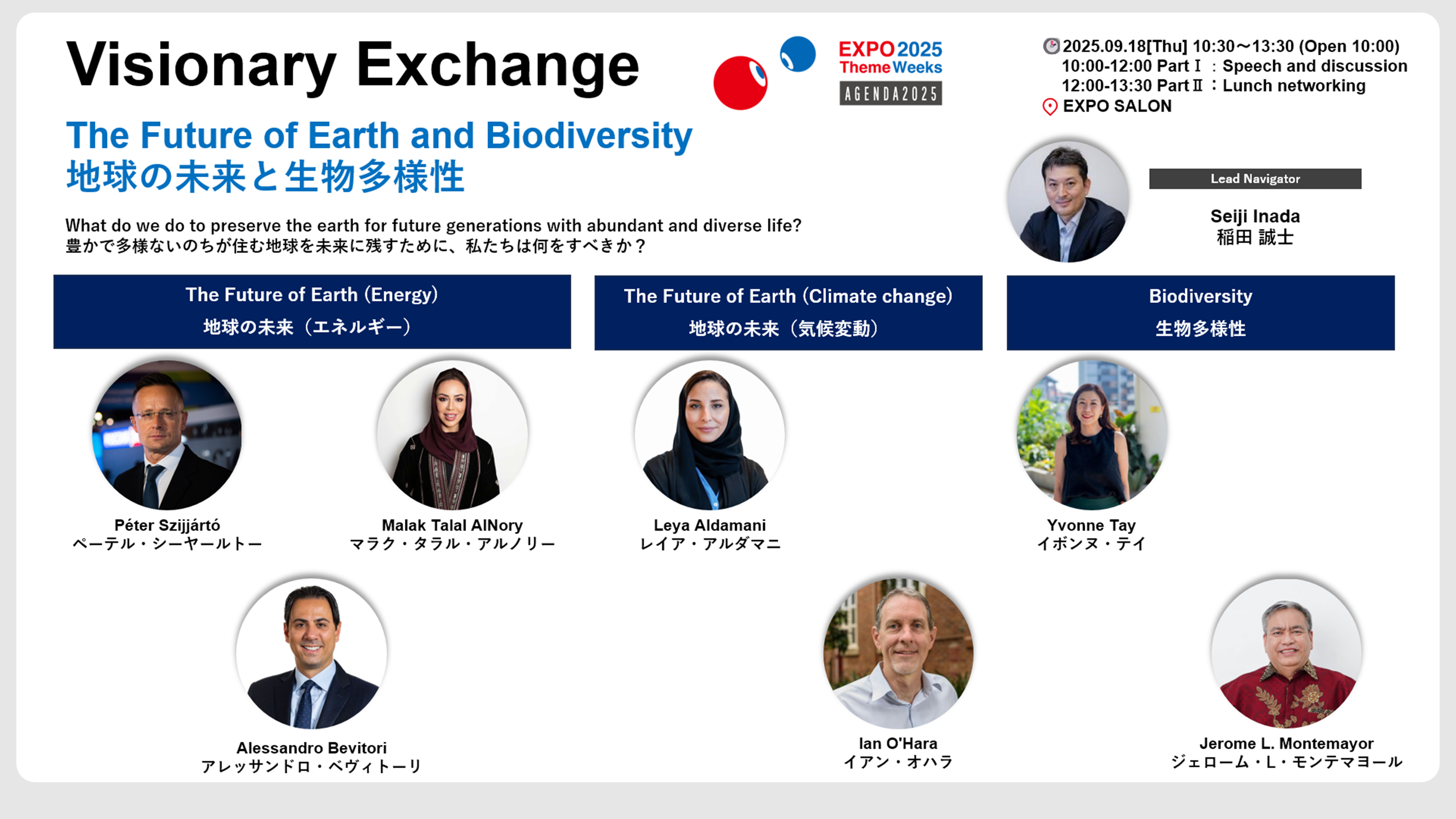 We are pleased to organise a speech and discussion event, as well as a lunch networking event, on the theme of the Agenda programme ‘The Future of Earth and Biodiversity’, entitled ‘Visionary Exchange’, as part of the Agenda2025 programme.This gathering aims to include business delegations, universities, scientists, government officials, Agenda2025 panelists, and relevant Japanese leaders from government, industry, and academia. Participants will engage in keynote addresses and networking sessions aligned with each Theme's focus.(Invitation only)