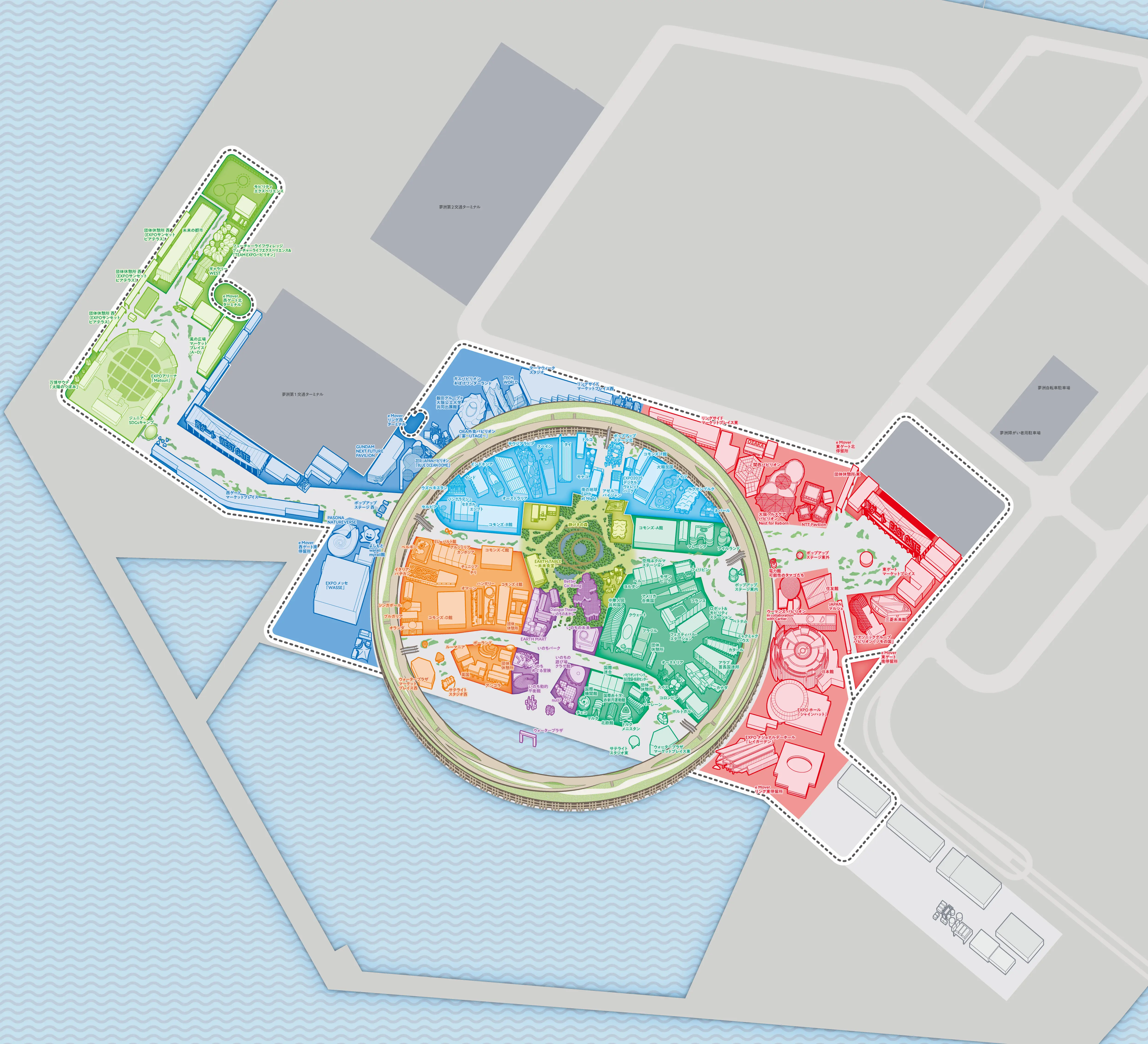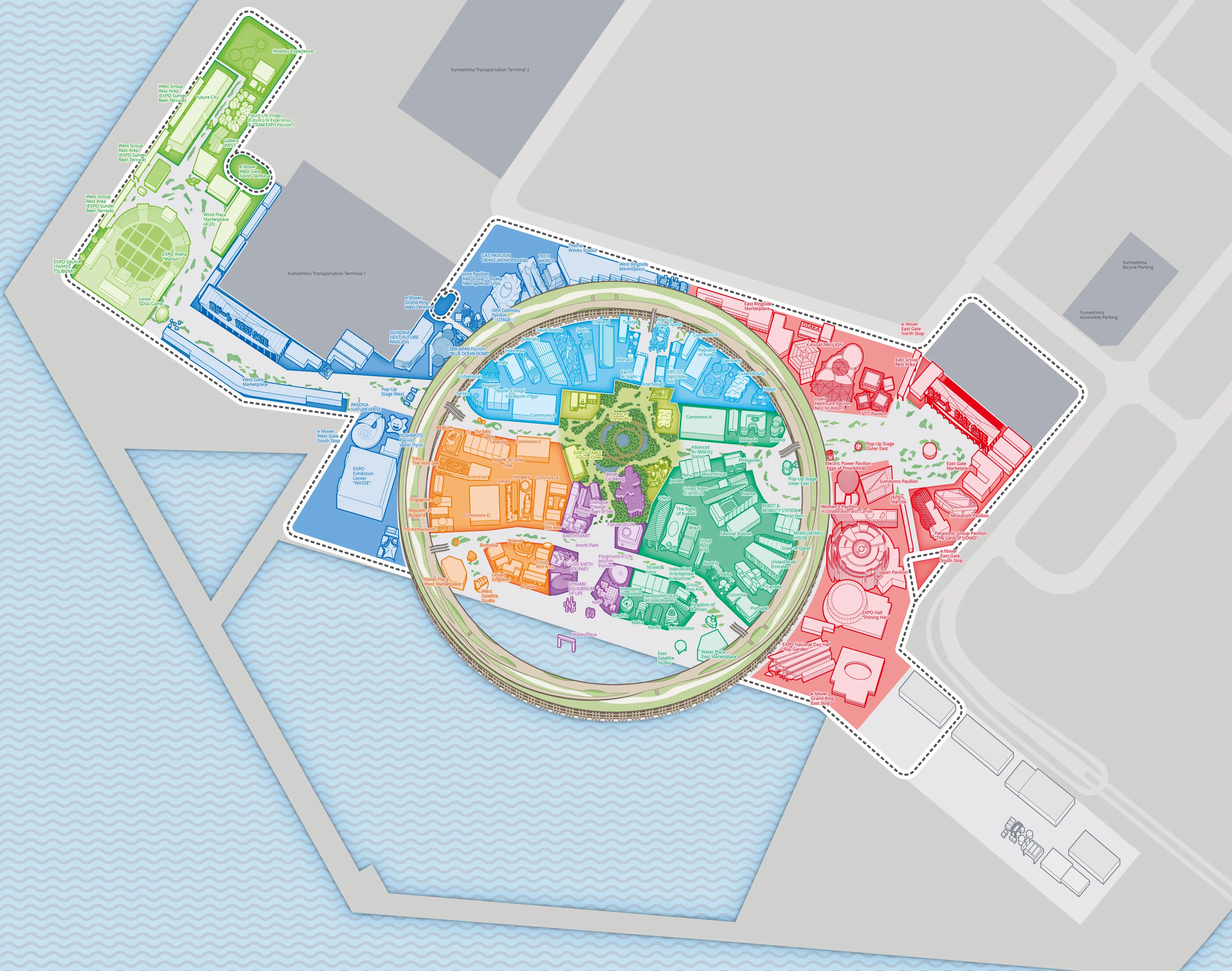 This page shows a map. On the map, there are buttons with the names of the zones and other information, and by clicking on them, you can visually find the pavilion you are looking for. If you have difficulty using the screen reader, please use the Pavilion Search or List View to find the pavilion you are looking for.