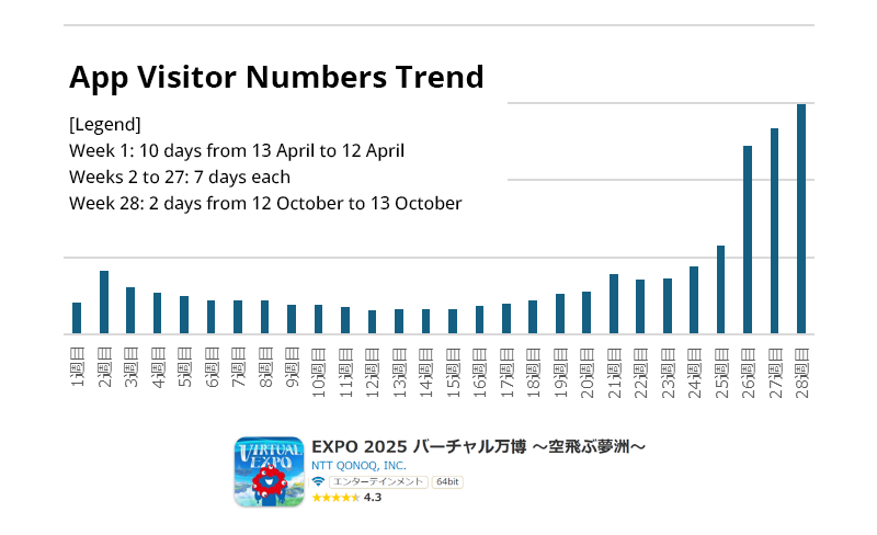 The total visitor number surpassed 1 million (23 April), 5 million (26 May), 10 million (29 June), 15 million (6 August), 20 million (5 September), and 25 million (27 September) in quick succession. Furthermore, from 10 September onwards, daily visitor numbers exceeded 200,000 for 34 consecutive days.