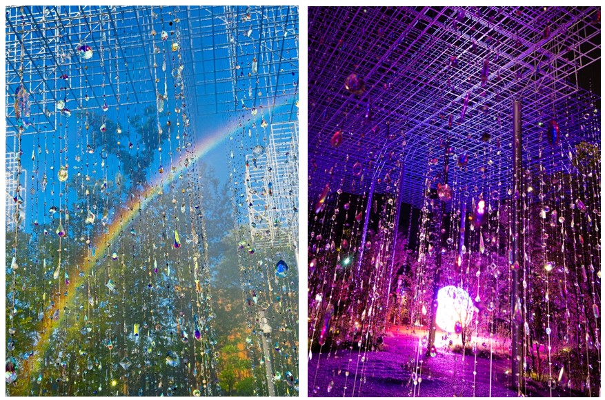 Designed by SANAA, the grid-like canopy structure eliminates walls and ceilings, seamlessly connecting the sky and forest. Approximately 400 delicate wires are suspended throughout the space, each adorned with a sun catcher. None of these suncatchers are arranged identically, symbolizing a “non-uniform collection” that celebrates diversity. On sunny days, these catch and refract natural light into rainbow hues, while artificial rain may produce actual rainbows. On cloudy or rainy days, mist and artificial lighting combine in a dreamlike display. At night, around 15,000 crystals illuminated by lighting fill the space with countless points of light, offering a luminous and immersive experience under a pavilion with no walls or ceiling. We invite you to enjoy the ever-changing ambiance shaped by weather and time of day.