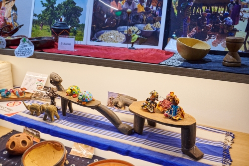 The pavilion exhibits of traditional musical instruments, attire, and sculptures as well as photos of international athletes.