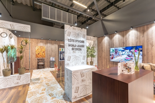 The pavilion includes displays and videos on the history and progress of cocoa production in Ivory Coast.