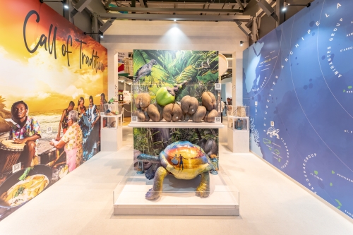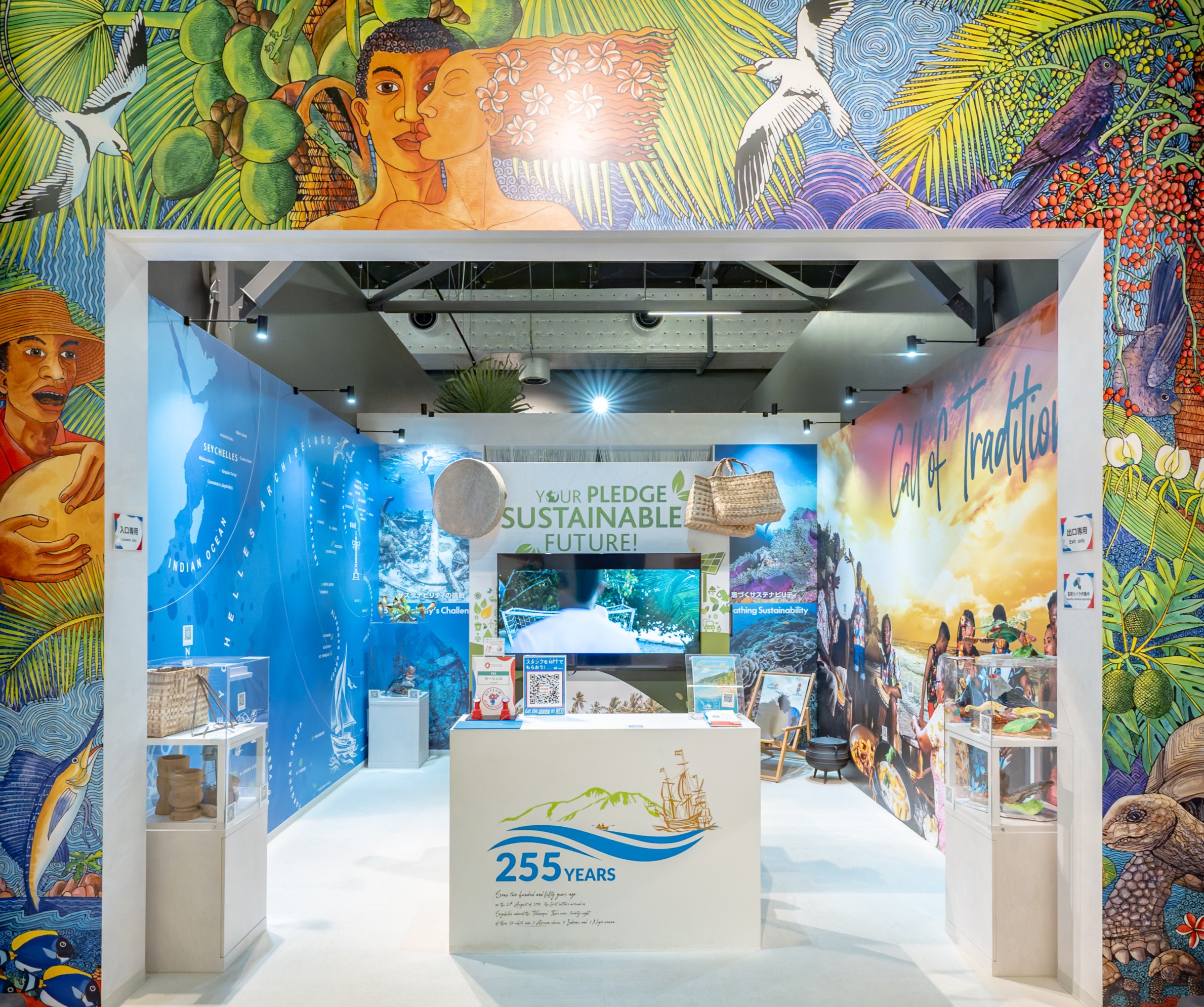 The pavilion intertwines the Seychelles coat of arms with its lush environment, showcasing the nation’s beauty.