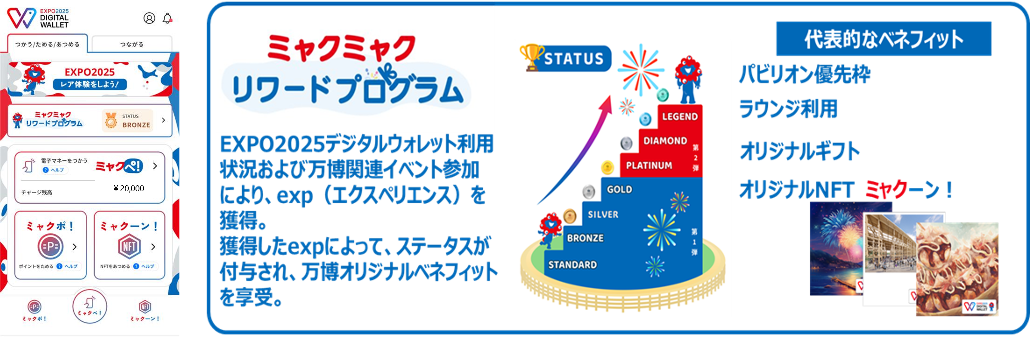 本サービスは、大阪・関西万博のテーマである「デジタル」「未来への行動」を個人が直接感じ、理解し、参加するツールと位置付けているスマートフォンのアプリを活用したウォレット「EXPO2025デジタルウォレット」のサービスの一つです。「ミャクぺ!」や「ミャクポ!」サービスの利用や万博関連イベント等へ参加することなどで得られる経験値によってステータスが決定し、そのステータス毎に特典を獲得できるプログラムであり、利用者の「使う楽しさ」を創出します。