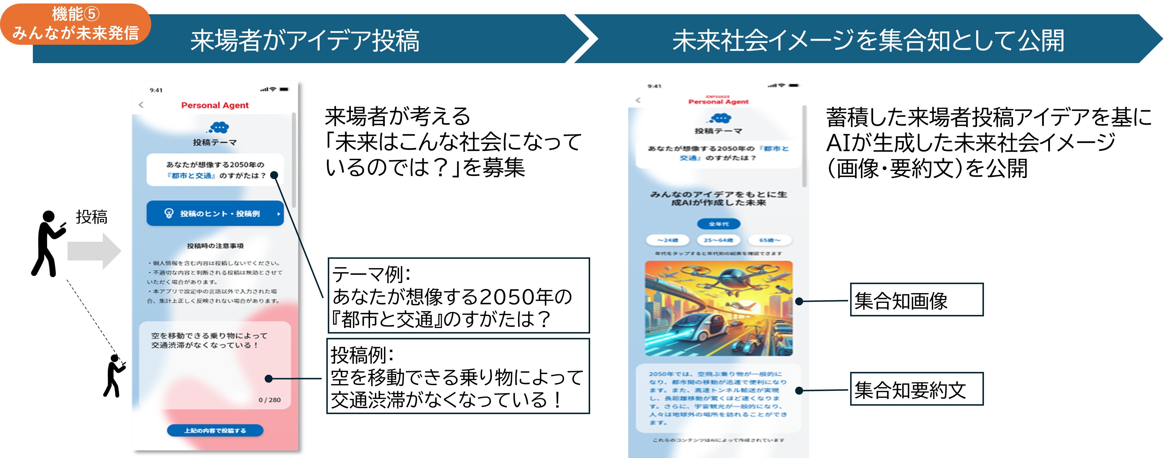 | 【機能⑤みんなが未来を発信】 | 来場者が利用するアプリ上で、来場者が考える「未来社会」像を投稿すると、集合知として言語化・可視化された「未来社会」像が確認できる。投稿参加型コンテンツとすることで、「みんなが想像する未来社会像」を創り上げていくことを来場者が実感できる。 |