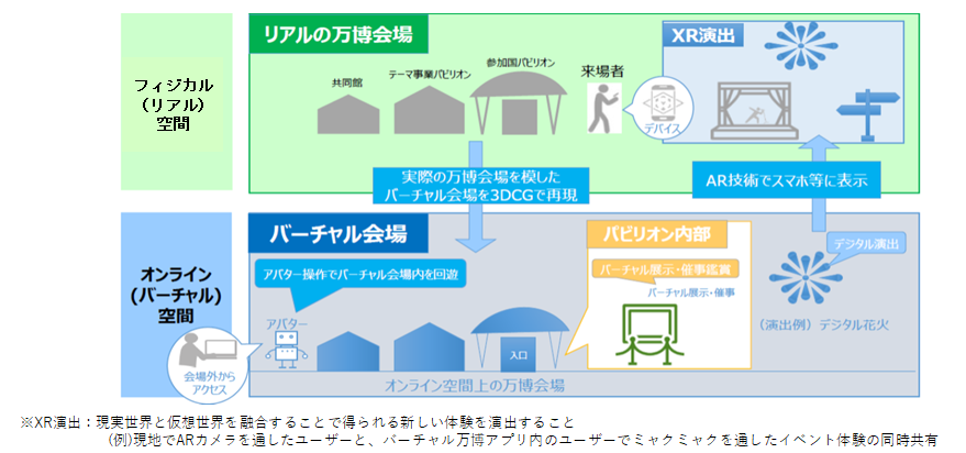 本サービスは、オンライン空間上に3DCGでリアルの万博会場(夢洲)をバーチャル会場として再現するものです。ユーザーはアバターを介して、バーチャル会場を散策するとともに、各出展者が展開するバーチャルパビリオン内部に入り、バーチャルならではの特性を活かした展示や催事を体験することができます。また、リアルの夢洲会場では、スマートフォンを使い、現実には存在しないキャラクターや3Dの立体が現れるAR※コンテンツも楽しむことができます。