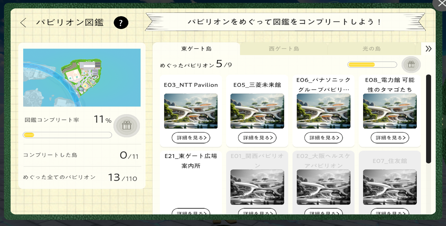 ユーザーの体験状況を管理するために、お気に入りイベントの登録や、訪問したパビリオンを参照できる機能、特定キーワードを知っている友人とのみ参加できる帯同モード機能などを提供する。