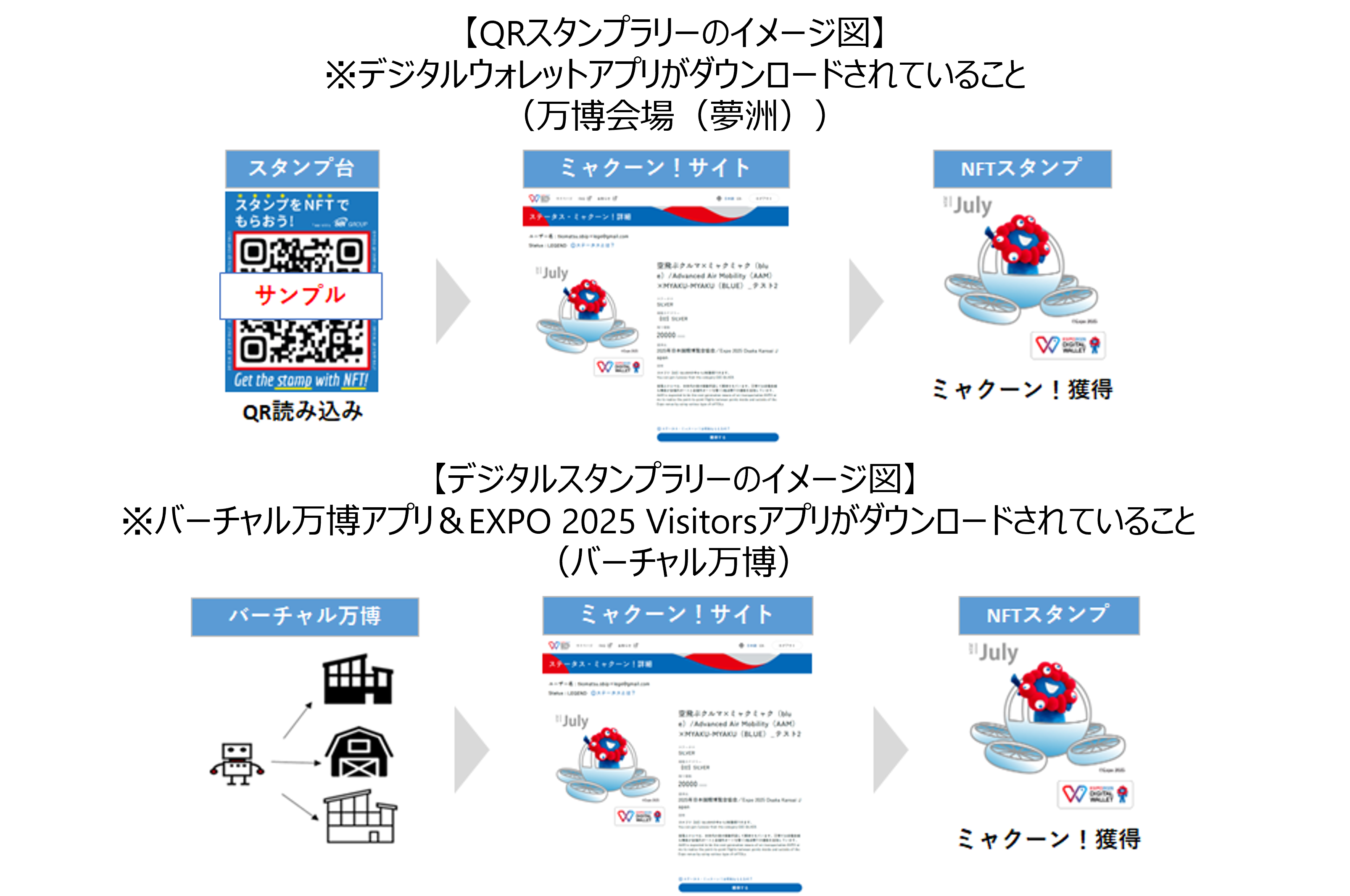本サービスは、公益社団法人2025年日本国際博覧会協会が主催するデジタルスタンプラリーに参加する来場者向けのサービスです。来場者は、EXPO2025デジタルウォレットアプリを利用し、万博会場(夢洲)のパビリオンに設置されているスタンプ台にあるQRコードを読み取ることで、NFTスタンプ(ミャクーン!)を獲得することができます。