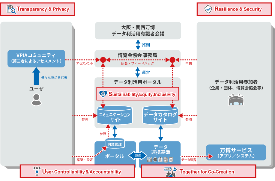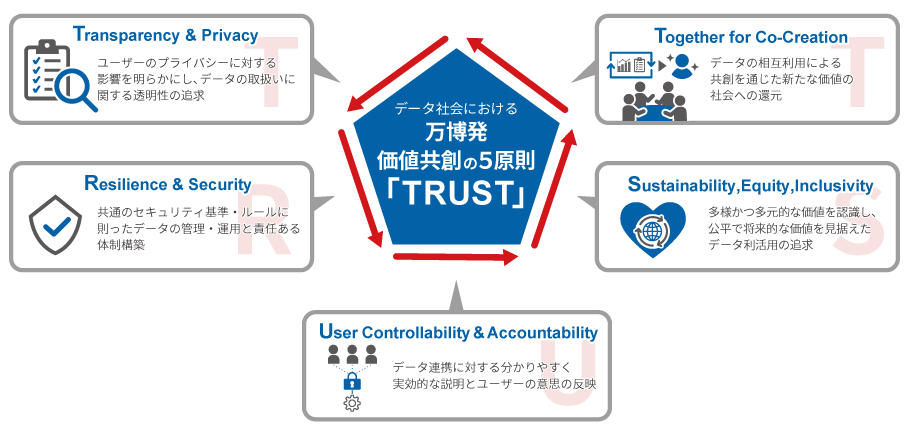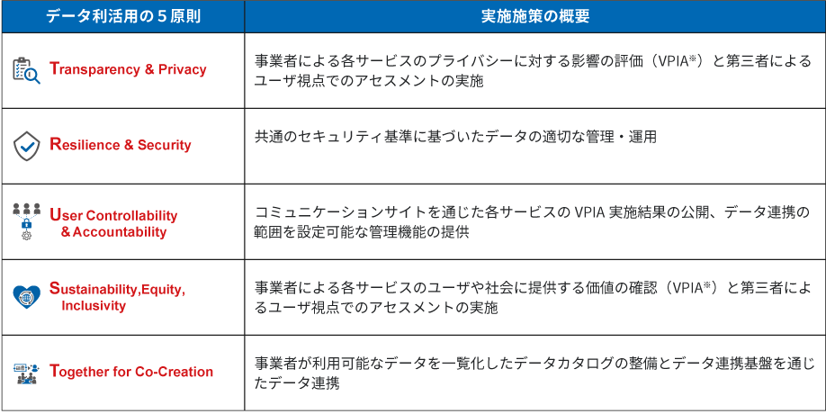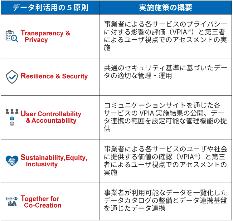 また、データ利活用に関する理念とともに、データの保護と利用を両立した信頼あるデータ利活用を通じた価値共創を行うための原則を定めています。