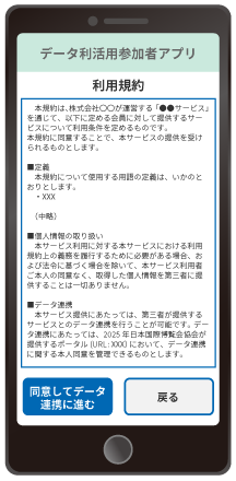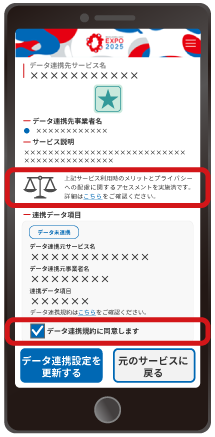 データ連携の設定にあたり、ユーザはサービス利用時のメリットとプライバシーへの配慮に関するアセスメント結果を確認した後、サービスの利用を開始します。