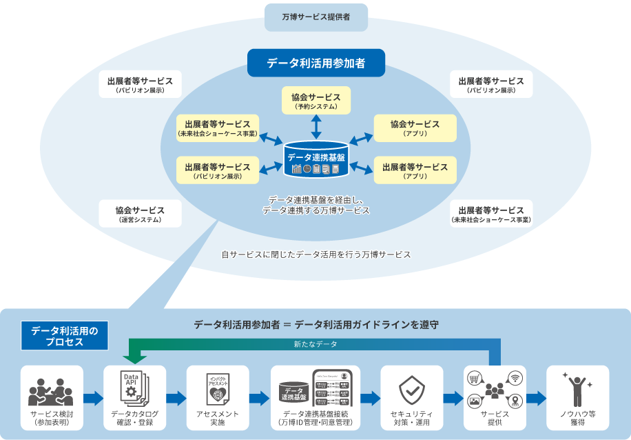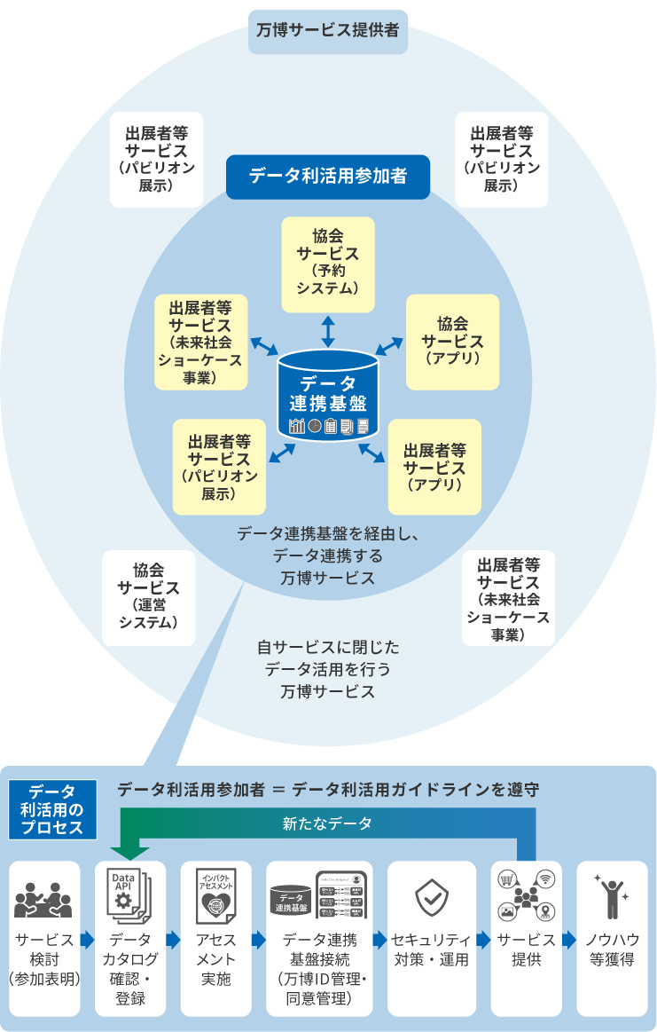 万博にてサービスを提供する事業者の中で、希望する事業者のみが本取り組みに参加し、データ利活用参加者として、データ利活用ガイドラインに定められたプロセスに従って、必要な対応を実施した上で、サービスを提供します。