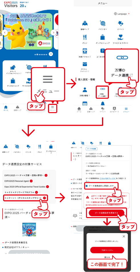 万博Visitorsアプリのメニューから「万博IDデータ連携」を選択し、連携の「同意」を行ってください。