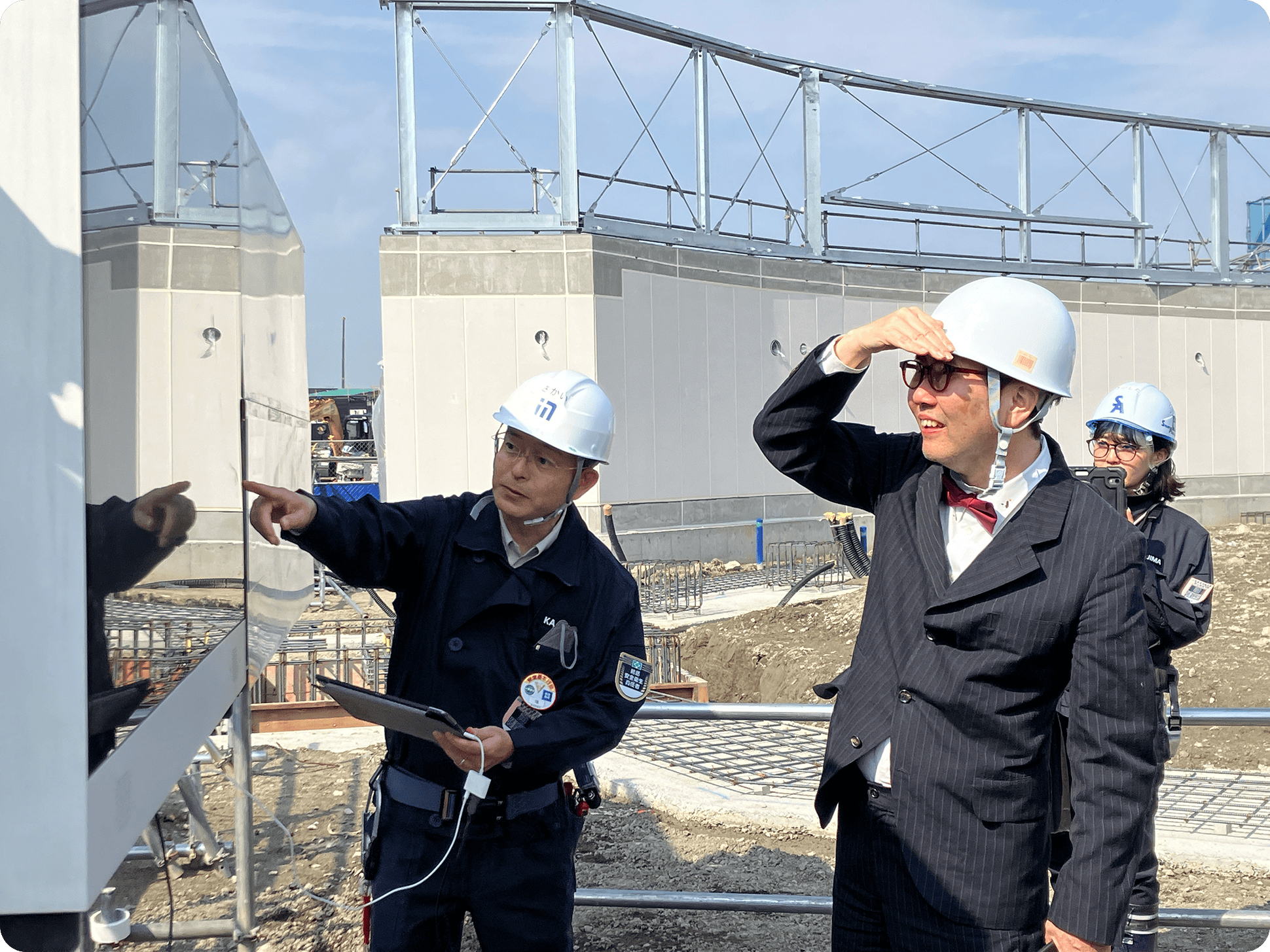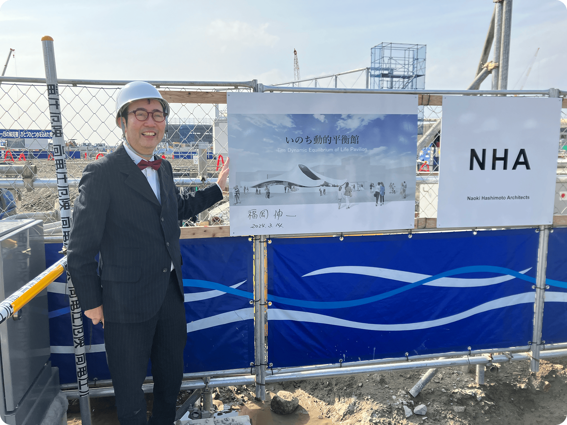 「いのち動的平衡館」の建築家 橋本尚樹氏と鹿島建設㈱ 境治彦所長から工事の進捗の説明を受け、順調に進むパビリオンの建築を確認しました。福岡伸一からは「くれぐれも安全に注意して工事を進めていただきたい。」とお願いがあり、工事柵に掲げられたパビリオン完成予想図に直筆で署名をしました。