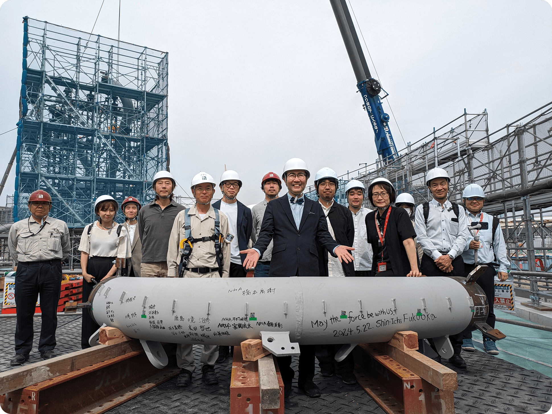 関係者全員の署名をした鉄骨を前に記念撮影