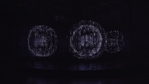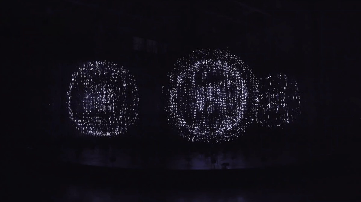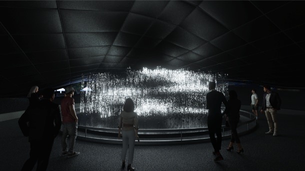 緒方壽人建築の内部の中⼼に、32万球のLEDを使って、直径が10m、全周廻ると30m、⾼さが2.5mある⽴体的なシアターシステムを作りました。