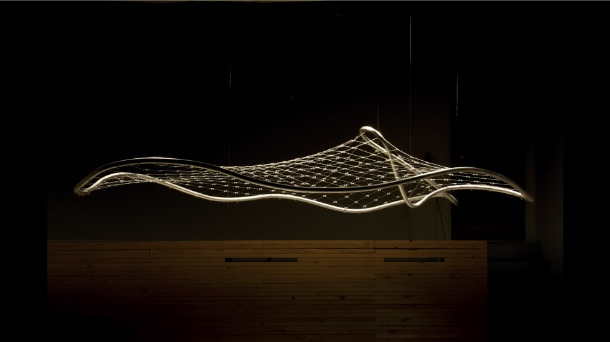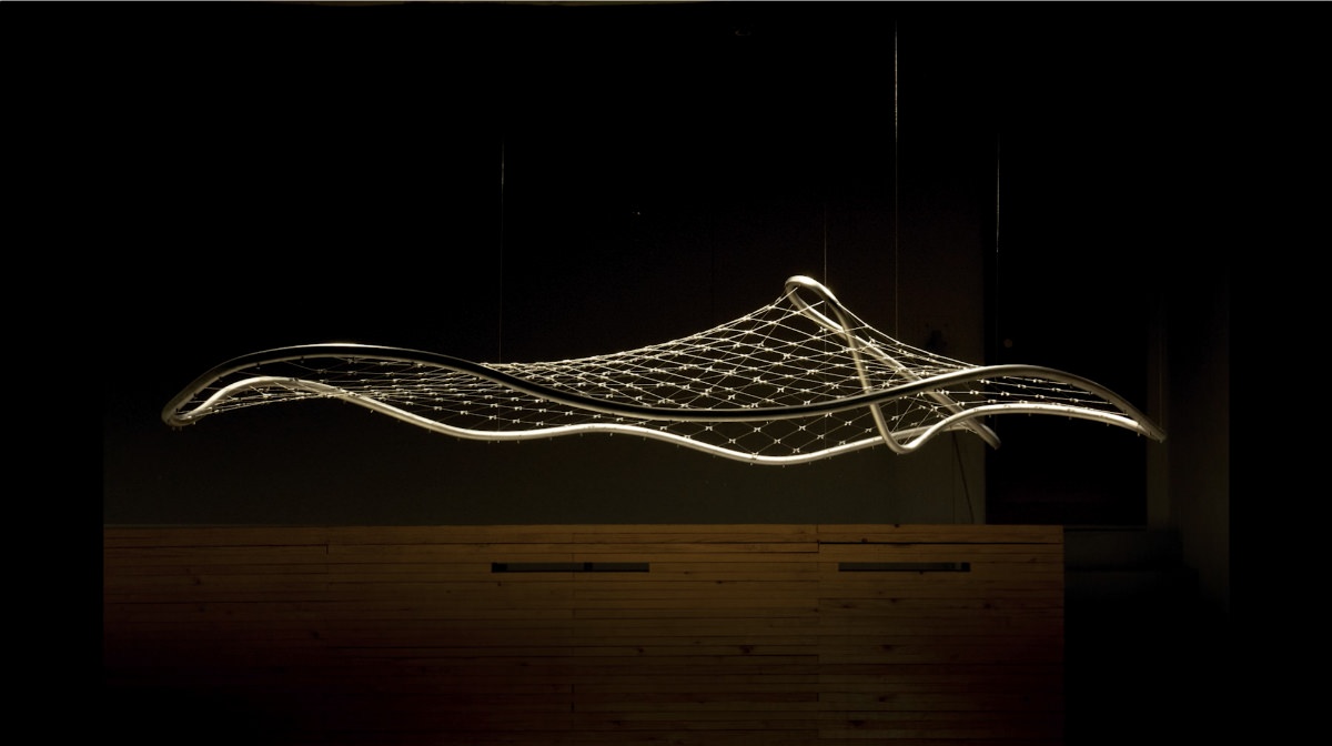 建築と絡むというところでいうと、この内部空間には柱がないようにし、また屋根がすごく特徴的な空間の中で、この空間の中に光が浮いているような表現をするために、すべて⾃⽴する構造で、この光の基板を組み上げました。