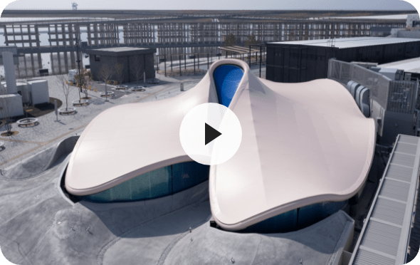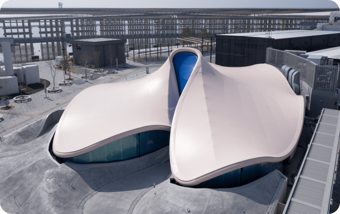 橋本尚樹このクラスラが中に置かれている建築というのは、全体としては⼤きさが⻑辺で40m、短辺で⼤体25mぐらいの柱のない⼤きな内部空間になっています。外から⾒ると、⼀⾒細胞膜がぎゅーっと⼀部貫⼊して、細胞分裂を今まさにしようとするような形になっていて、その貫⼊した部分から、⼊⼝として⼈が⼊っていきます。