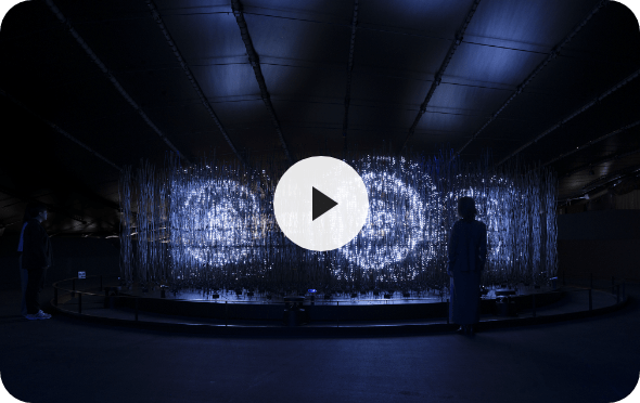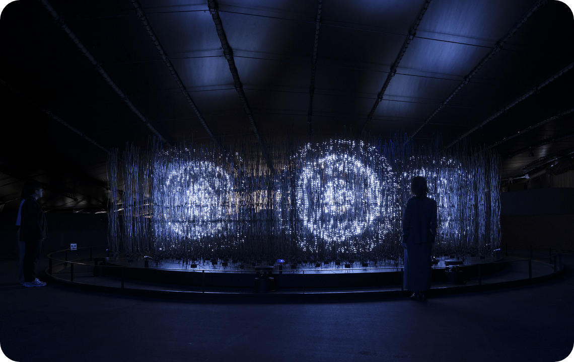 ⾮常に動的なプレゼンテーションとして、光の粒で⽣命のありよう、利他性や協⼒、共⽣というものを皆さんにお届けするという意味で、この光のインスタレーションも建築と同じように、現在の建築の主流的な考え⽅、インスタレーションや画像の主流の考え⽅に対する、⼀種のアンチテーゼとして皆さんにお⽰ししているわけです。