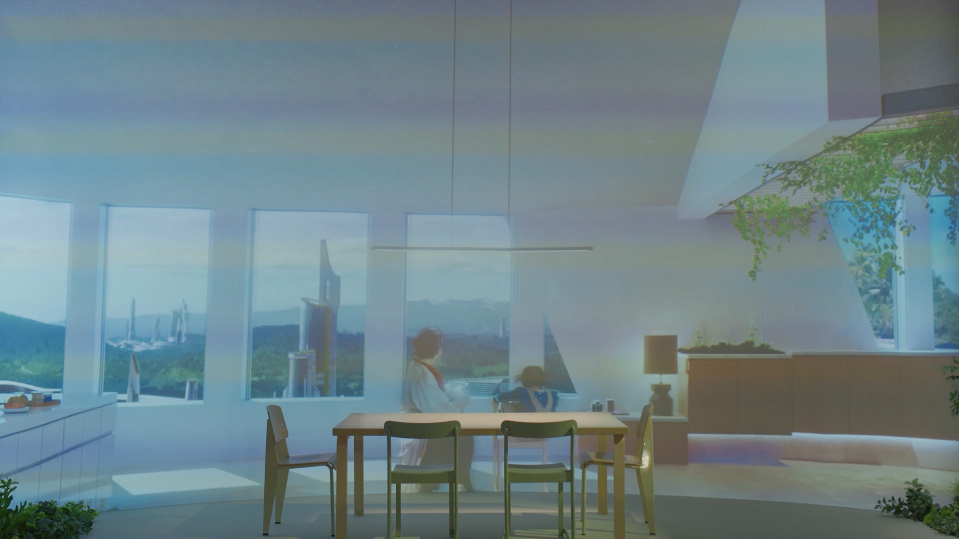 顔合わせを行った最初の打ち合わせで石黒先生から言われた「君の描いた未来には絶対にならない」という一言が今でも忘れられません。先生から50年後どうなっていると思う?と聞かれて、ちょうどそのときにつくっていたアニメのコンセプトアートを見せて「こういうワクワクする未来になると思います」と伝えたときに言われた言葉です。その絵には、みんながロボットになって、空を飛んで……といった「ザ・SF」的なイメージを描いていました。一方、先生からは「もともと持っていた伝統文化がもっとにじみ出てくる未来」、「より自然と共生した新しい社会」といったイメージや考え方を聞かせていただき、とても腹落ちしました。