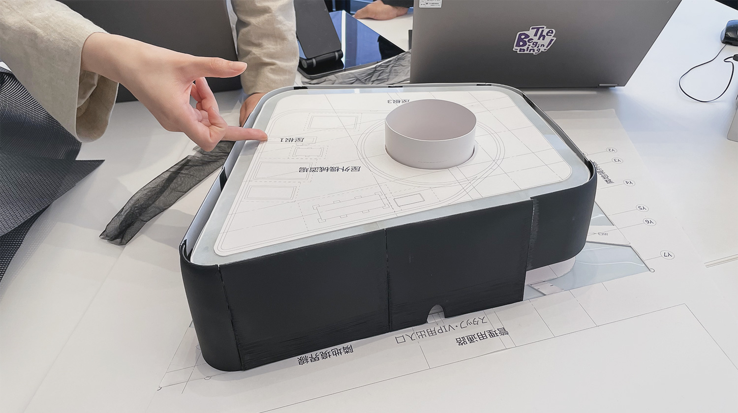 「最終的には外装材に“膜”を使い、そこを水が流れるような水景を描くことに。外装材も金属パネルやカーボンファイバーみたいな炭素繊維も検討していたのですが、重さやコスト、何より水との相性など総合的に考えて、膜を採用することが決まりました。外装を膜にすると決めてからも、その納まりやたたずまいとしての美しさなど、考えることは山ほどありましたね。当然、金具など何かしらで膜を留めなければならないのですが、風が強い日など水が流れないときに、その部分が目立ってしまったら石のオブジェのようには見えない。どう見えるかの検証も何度も行いました。循環させる水の回収の仕方は、2020年のドバイ万博で見たインスタレーションも参考になりましたね。また石黒さんからは、均一に水を流すために吐水部分へ均等に切れ込みを入れてはどうかというアイデアをいただき、その可能性を検証しています。最終的な水景表現は、今も試行錯誤が続いています」