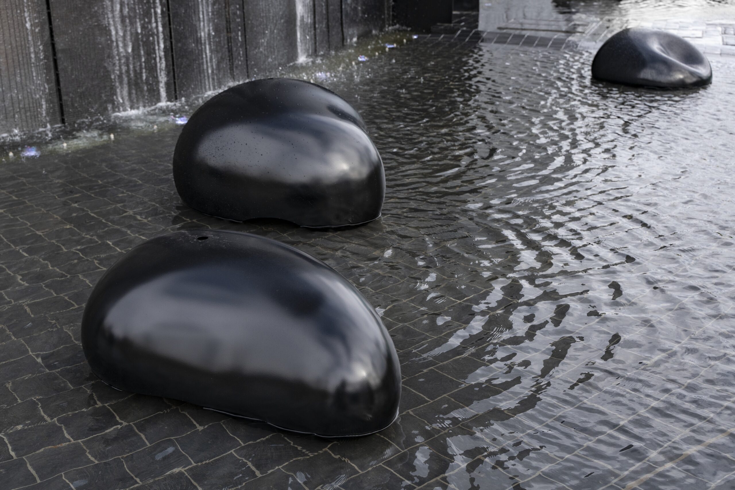 パビリオン外溝の水景を構成するオブジェには、実は水質計が隠れています。また、パビリオン出口の天井には大気計が潜んでいます。水質計は水盤の水の状態を、大気計は館内の空気の状態を24時間リアルタイムで計測します。水と大気の2つの計測から得られた値が2つの光の波となります。HORIBAの優れた計測技術が、人の感覚では感じ取れない微細な変化を捉えて光の強弱を生み出します。