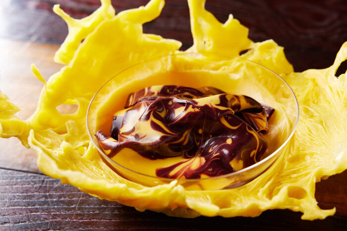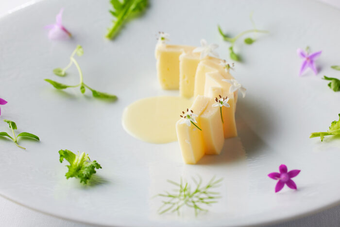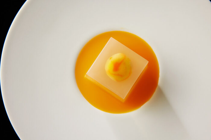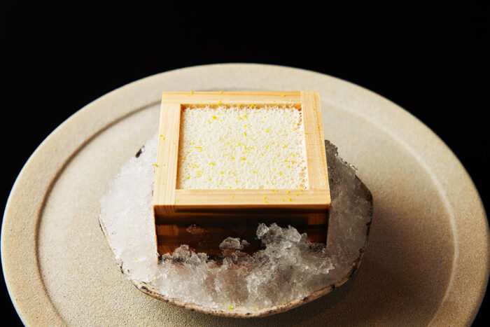 瑞々しい錦玉製のお菓子は冷たくひんやりと清々しい。センシュアルな食感と口内と脳裏に広がる香りに身を委ねる瞬間、はるか昔に存在していた寺院を思わせるような高貴な香りが漂い、自分の中に透明な何かが生まれてくる。準絶滅危惧種の日本最古の柑橘「橘(たちばな)」の果実と花の香を閉じ込めた錦玉羹を、京都の老舗「京菓子司 金谷正廣」の金谷 亘氏が制作。橘の果実と葉のソースで仕上げたデザート。