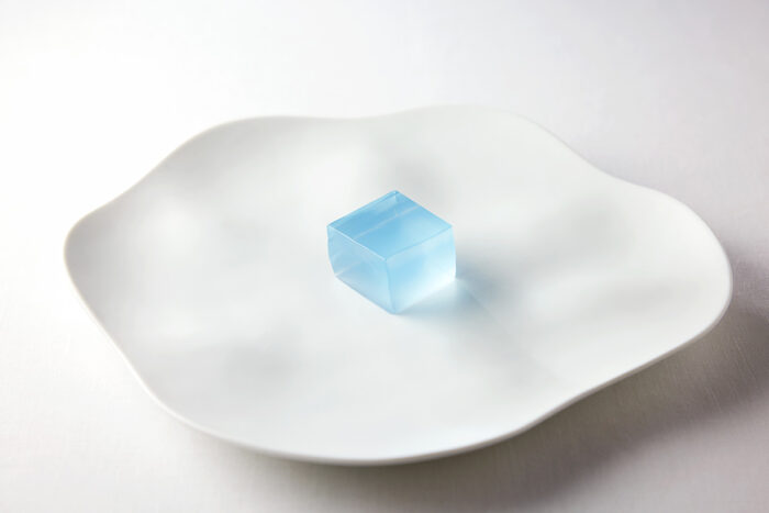 海藻は水を濾過するだけでなく、光エネルギーを有機化合物に変換し、光合成により酸素を放出して水生生物の呼吸を担保する。食物連鎖の最初の輪として多くの生命を育む海藻は今、人間の活動から直接的な影響を受けている。我々は最大限の配慮と敬意をもって海藻と向き合うべきである。この青いゼリーは、牡蠣に含まれる海水にさまざまな海藻を混ぜたことで生まれた。海藻がいかに美しく、儚く、尊い存在であるかを感じて欲しい。
