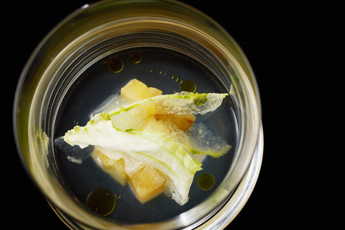 かつて栄養素は1gでも尊いものだった。いかに食物を蓄え、栄養を引き出すかは世界の料理文化に共通する命題だ。料理はおいしい悦び以前に命をつなぐ行為なのだ。水は「保持と拡散」という相反する作用によって調理の中心にある。この芳しい水は、火力を使わず常温で作った。何も捨てずにすべてを使い切り、素材の栄養素とカロリー、おいしさを引き出せれば、CO2排出を最小限に抑えながら味わいを享受することができるだろう。