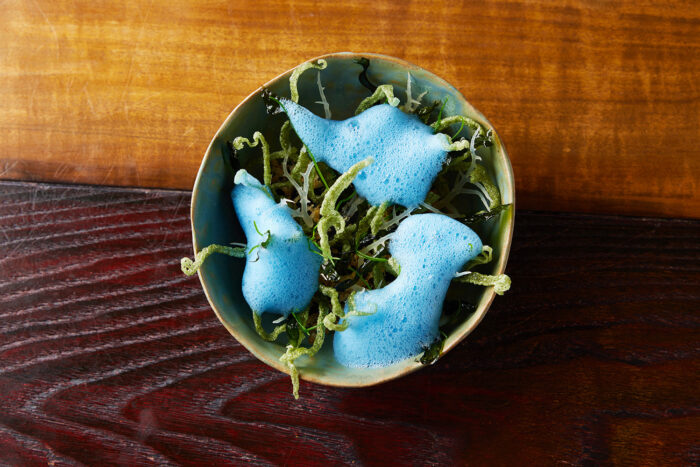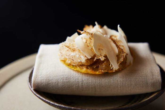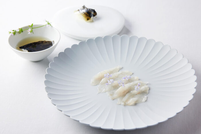 いかにも毒草らしい模様のこんにゃくの茎だが、藁灰を濾した汁と合わせると毒が消え、こんにゃく芋本来の味が引き出される。そんな先人の叡智に敬意を表した料理で、味付けにふぐの卵巣を使った。ふぐの卵巣は3年間糠漬けにすると微生物により無毒化される。これを酒に浸し、出汁として使い、エスプーマに仕立てた。知恵により毒が無毒になり、美味しさに変わる。料理人はそれを拝借し少しだけ新しい味を生み出しているに過ぎない。