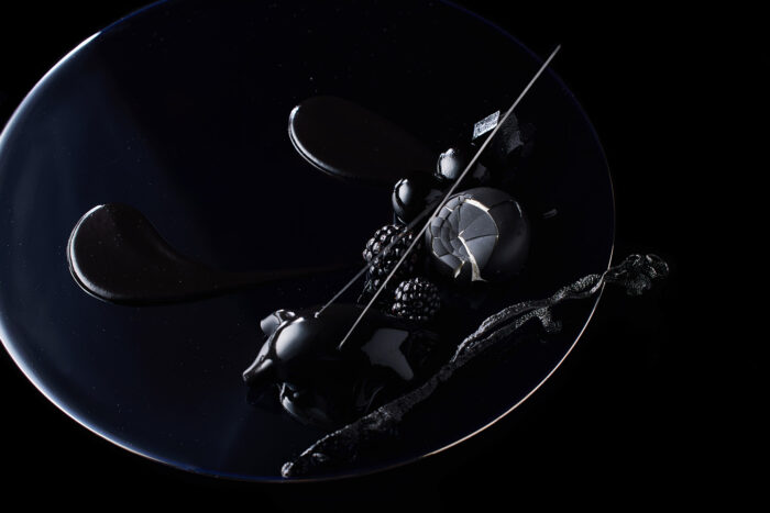 眠れない夜、部屋の灯りを少し落として過去に想いを馳せてみようか、それとも未知の世界に踏み入れてみようか。迷っている間にひとりで宴をあげよう。虫の声や鐘の音が懐かしいが、憧れだった昔のプレイリストでも流しながら。和菓子の琥珀糖という技術、 能登の全壊した酒蔵 数馬酒造で救出されたもろみでできた新酒を使い、香木の伽羅や無農薬の和歌山のレモンで香りづけした「漆黒のデザート」。