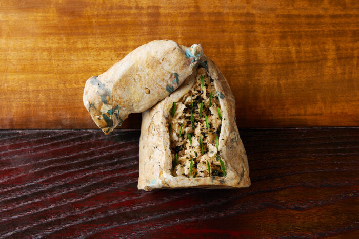 豆乳を使った加工品は数多く存在します。昔から、精進料理などで豆乳を活かした料理がたくさん作られてきましたが、伝統的な調理法がありながらもまだまだ面白い使い方の可能性が残されていると感じています。豆乳から作られる湯葉は、包む料理に適しており、味が繊細であっさりとしていて癖がないため、様々な食材と組み合わせることが可能です。今回は、特徴的な味や香りを持つ食材と合わせて仕上げました。