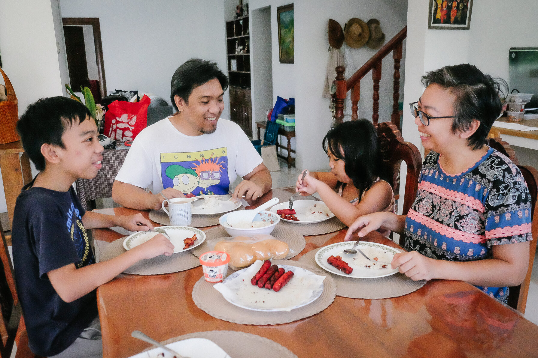 主食はお米であり、フィリピンは世界の中でも一人当たりのお米の消費量が多い国の1つです。ララさんの食事からもお米が良く食べられていることが伺えますが、レストランではごはんがお代わりできる、アンリミテッドライスというメニューがあったりします。お米を主食、おかずに焼きそばという組み合わせにもよく出会います。ご飯のおかずとして食卓によく並ぶものとして、コーンビーフやイワシなどの缶づめやウィンナーなどの加工肉があります。ご飯やおかずは大皿に並び、自分のプレートに取り分けて食べるスタイルが一般的です。